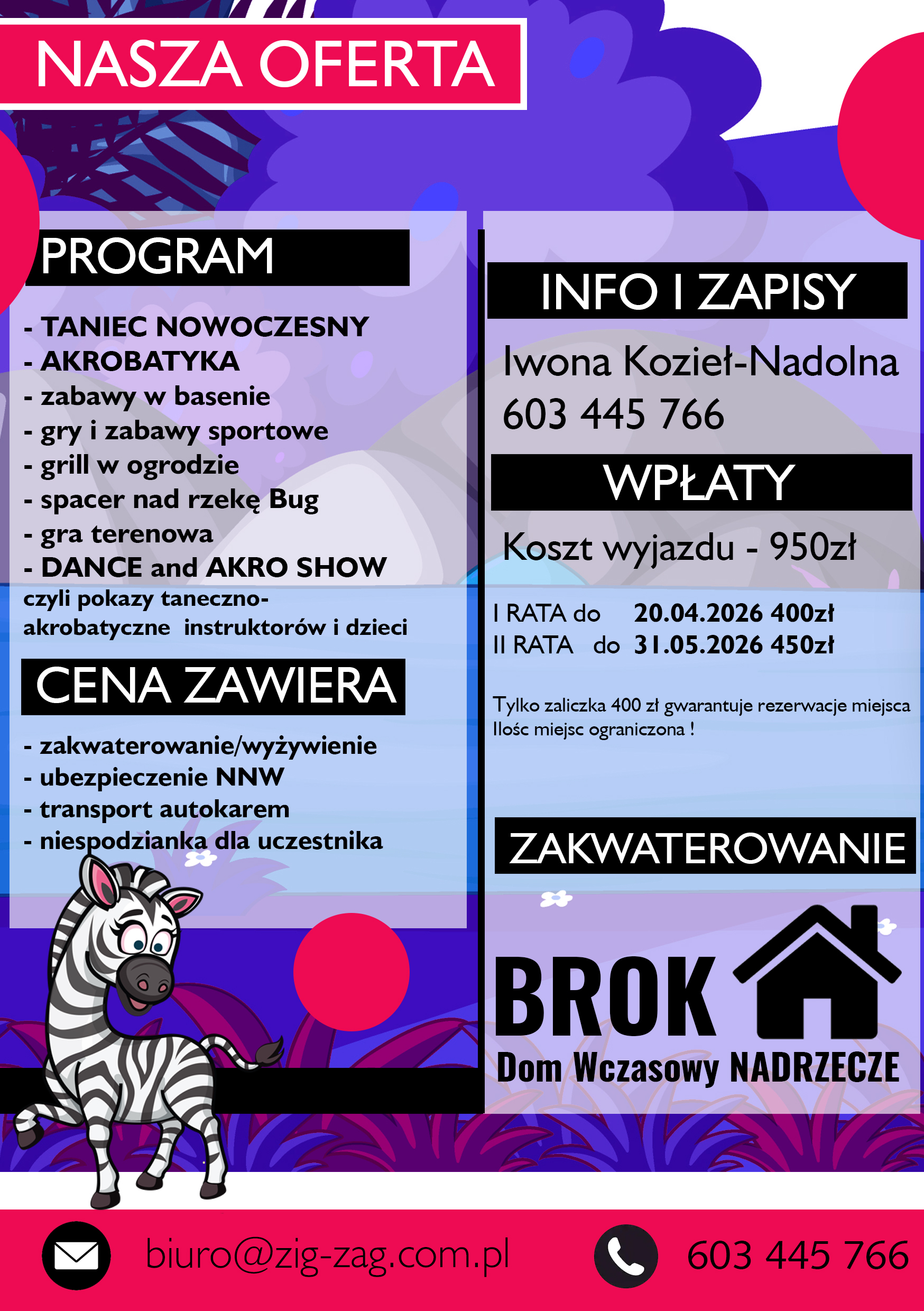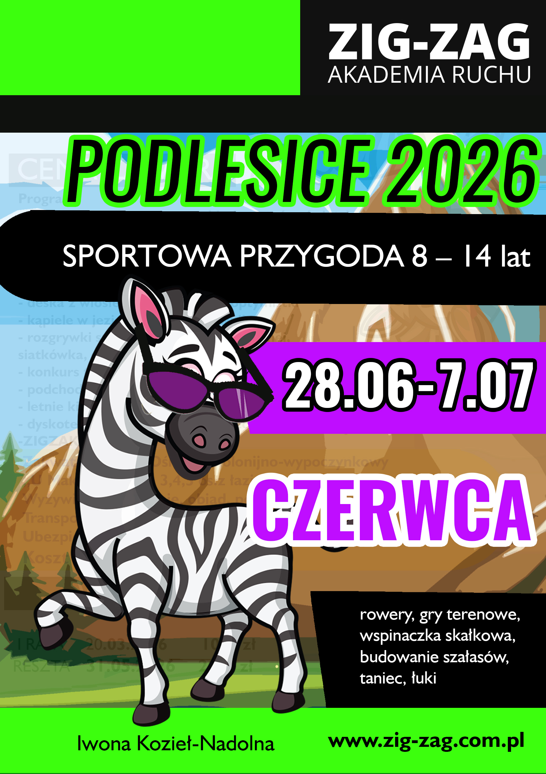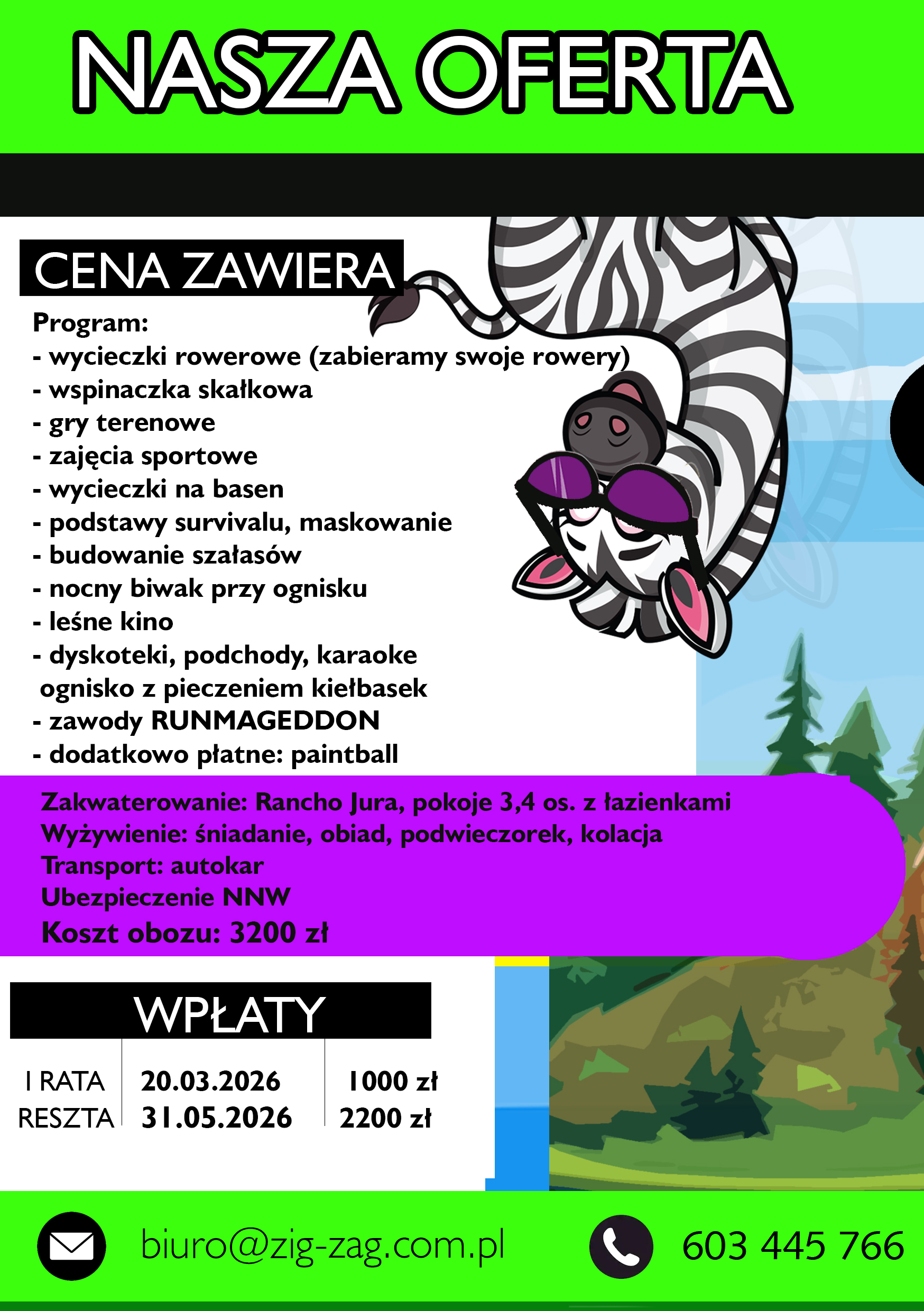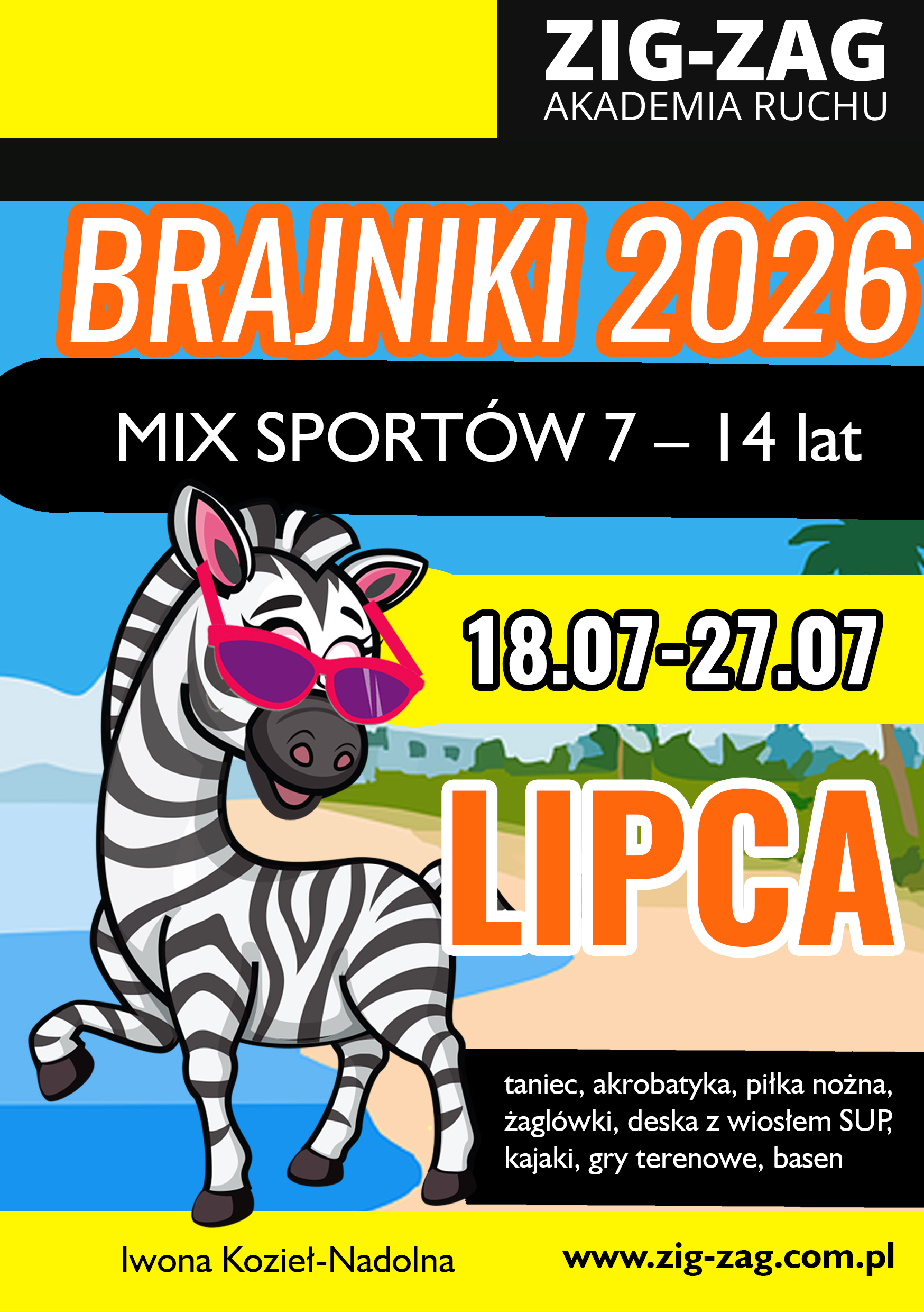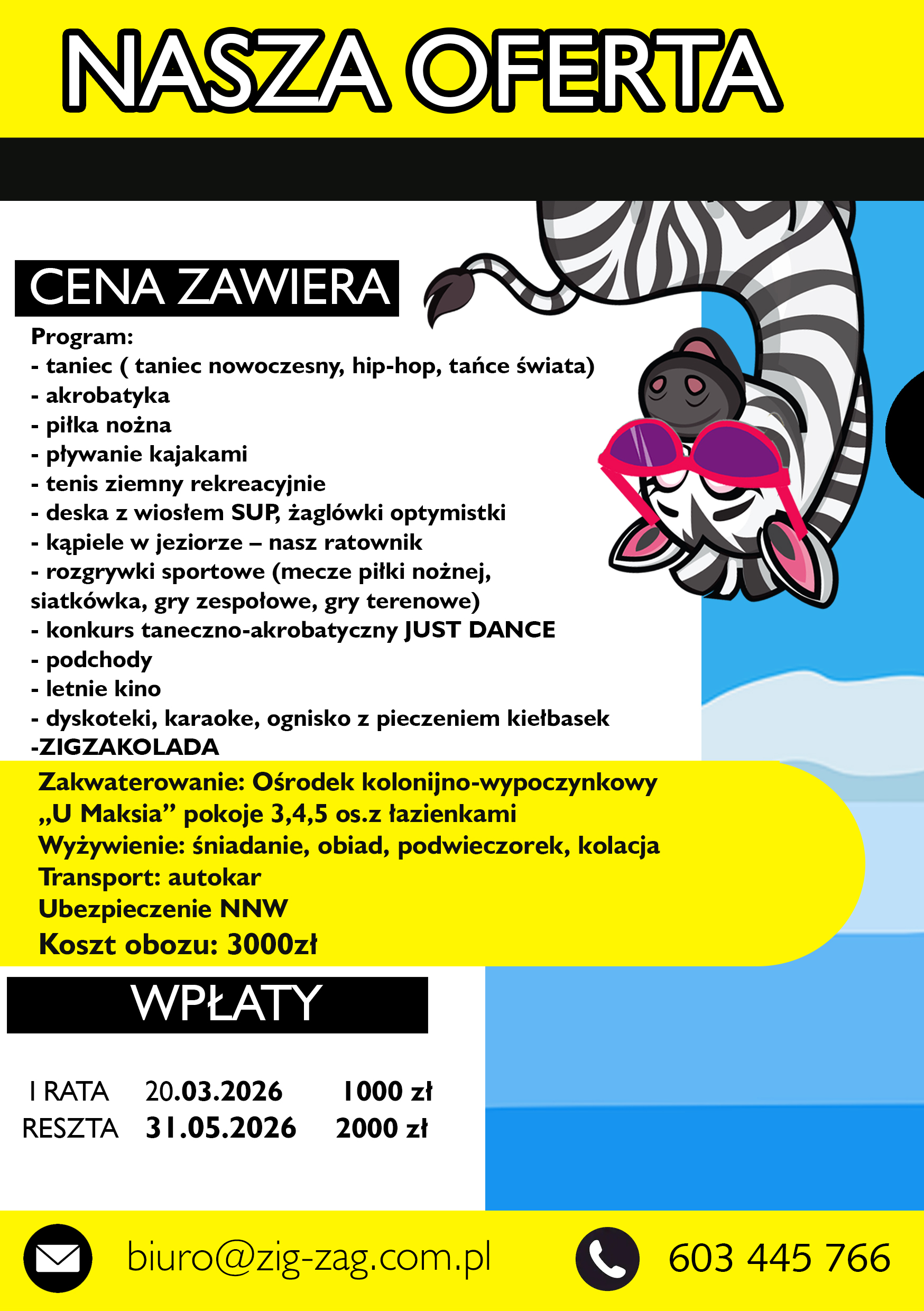 Stawiamy na bezpieczeństwo, aktywność fizyczną i zdrowy styl życia. W naszej ofercie znajdują się różnorodne zajęcia sportowe takie jak taniec, piłka nożna, akrobatyka, gimnastyka, pływanie, wspinaczka, kajakarstwo czy jazda na rowerze. Nasze obozy to miejsce, gdzie dzieci mogą poznać nowych przyjaciół, rozwijać swoje pasje i umiejętności, a przede wszystkim wypocząć. Organizujemy wiele atrakcji pozasportowych, takich jak gry terenowe, ogniska, dyskoteki czy wycieczki krajoznawcze. Dbamy o to, aby każdy dzień na obozie był wypełniony po brzegi niezapomnianymi przeżyciami.